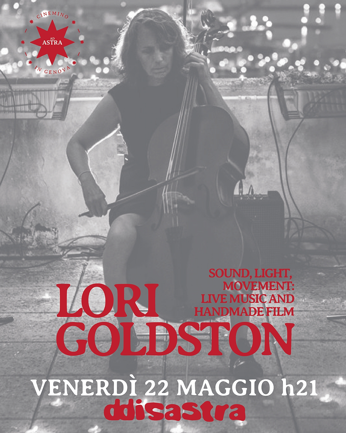 Da grandi fan (ha suonato con Nirvana, Earth, Larsen…) e amici di Lori Goldston, abbiamo cospirato per anni per riuscire a tirare su una cornice adatta a questo programma di sonorizzazioni, selezionate da Caryn Cline dell’Engage Film Festival di Seattle. In chiusura della seconda stagione Ad Astra e con un nostro progetto di autoformazione alla sonorizzazione, il Catenino Cinematico, in corso, abbiamo pensato fosse finalmente giunto il momento per invitarla ad eseguire queste partiture per violoncello su cortometraggi sperimentali.